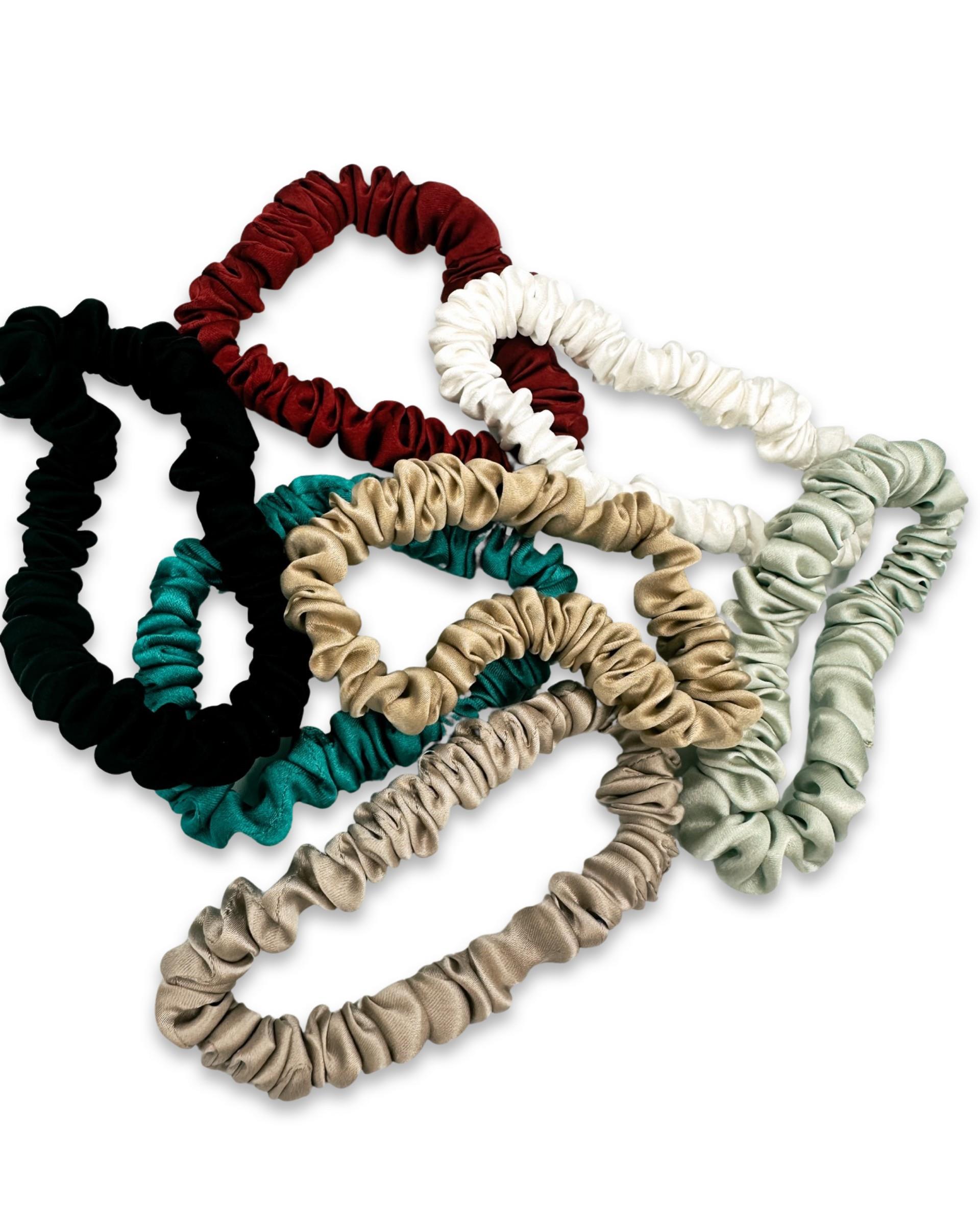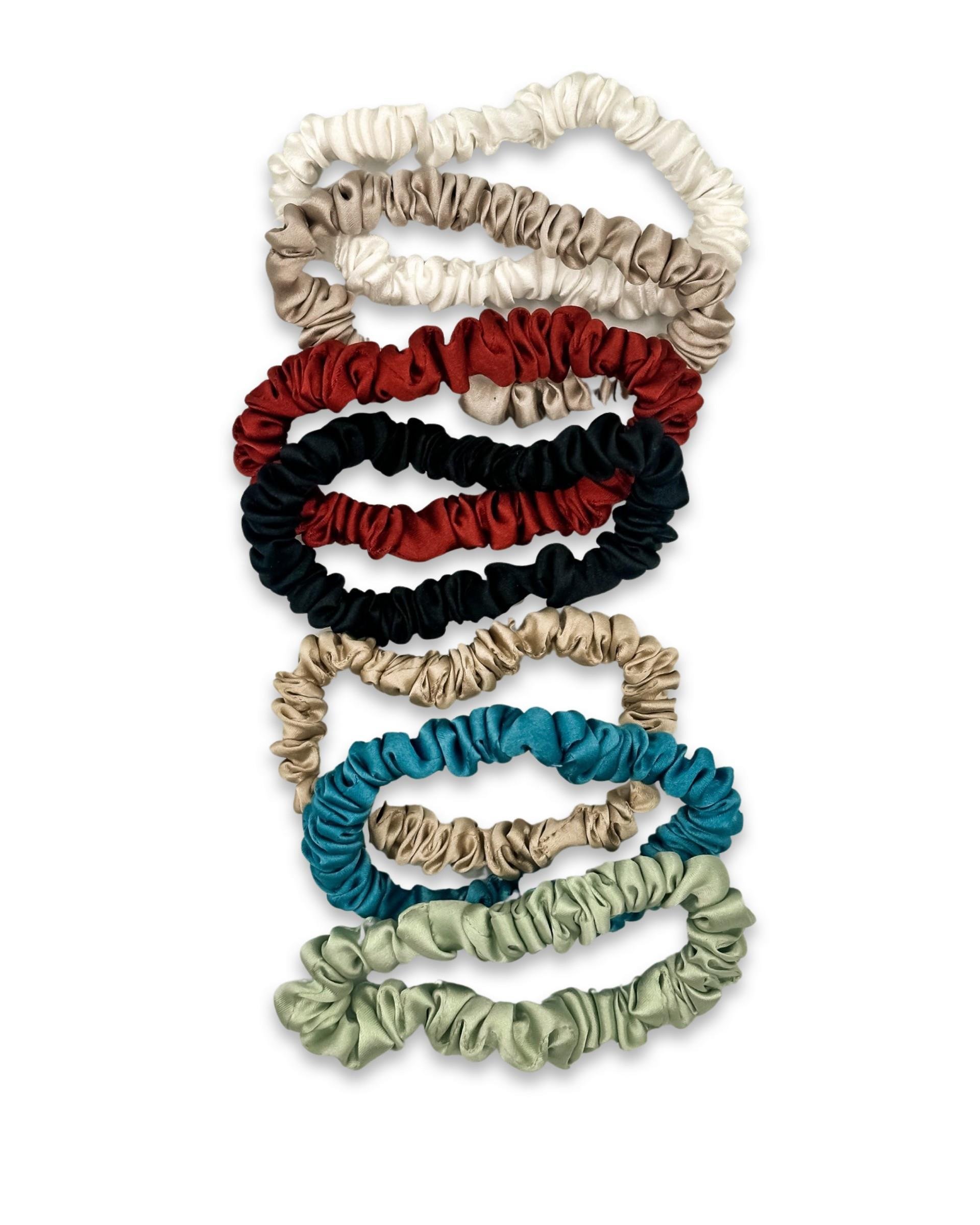 Treat your hair and skin or make a beautiful gift to your loved ones chosing from our 100% Silk Accessories. Protect your hair from frizz and tangles wearing beautiful Silk Scrunchies. Chose from various styles and beautiful colors for a quick and easy everyday styling essential. Your hair will be thankful to you. Material : 100% Silk Size : 1 cm Fabric Type : 16 Momme 100% Mulberry Silk