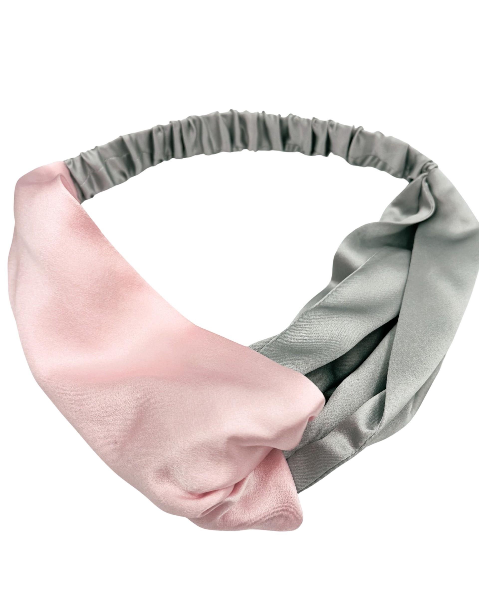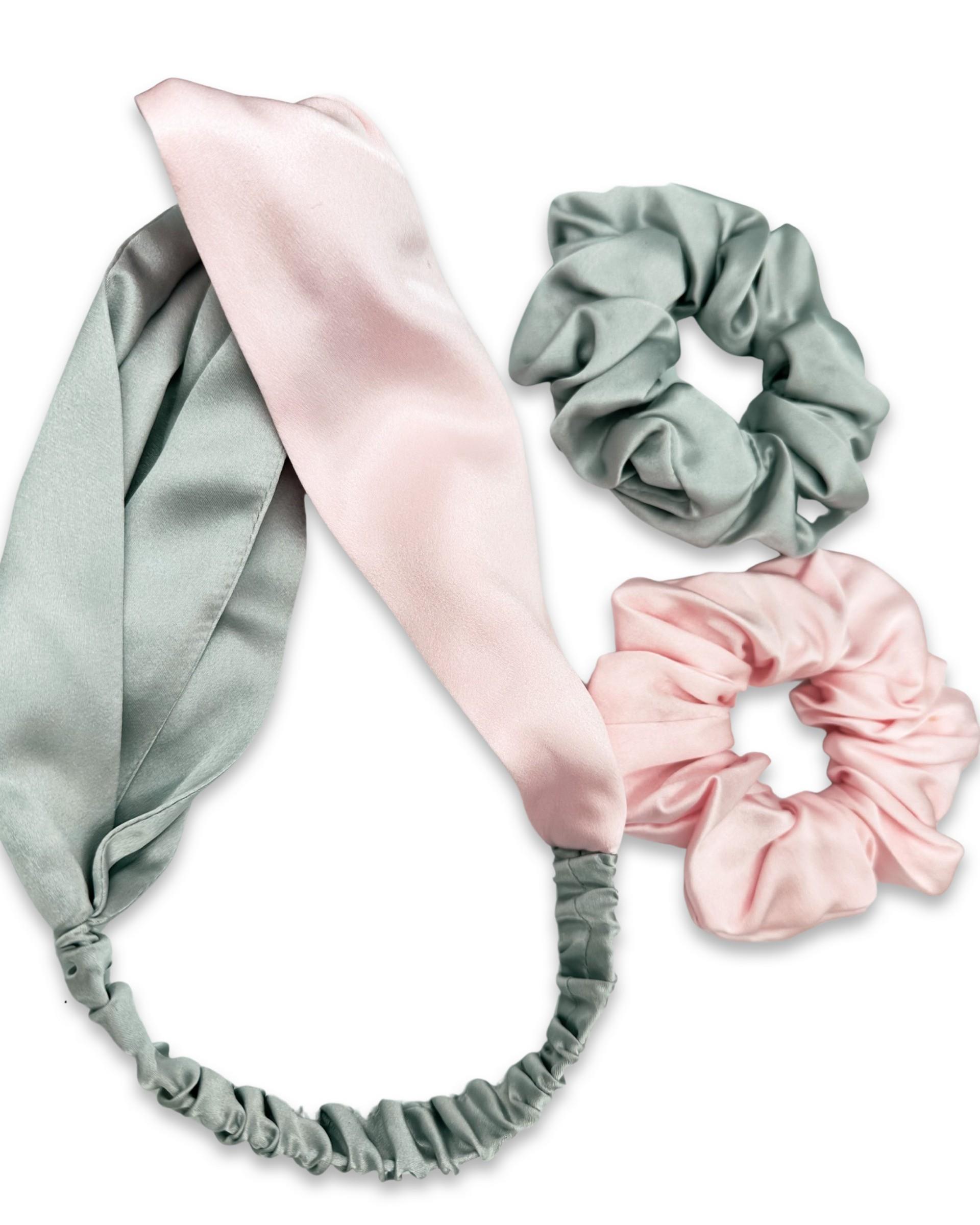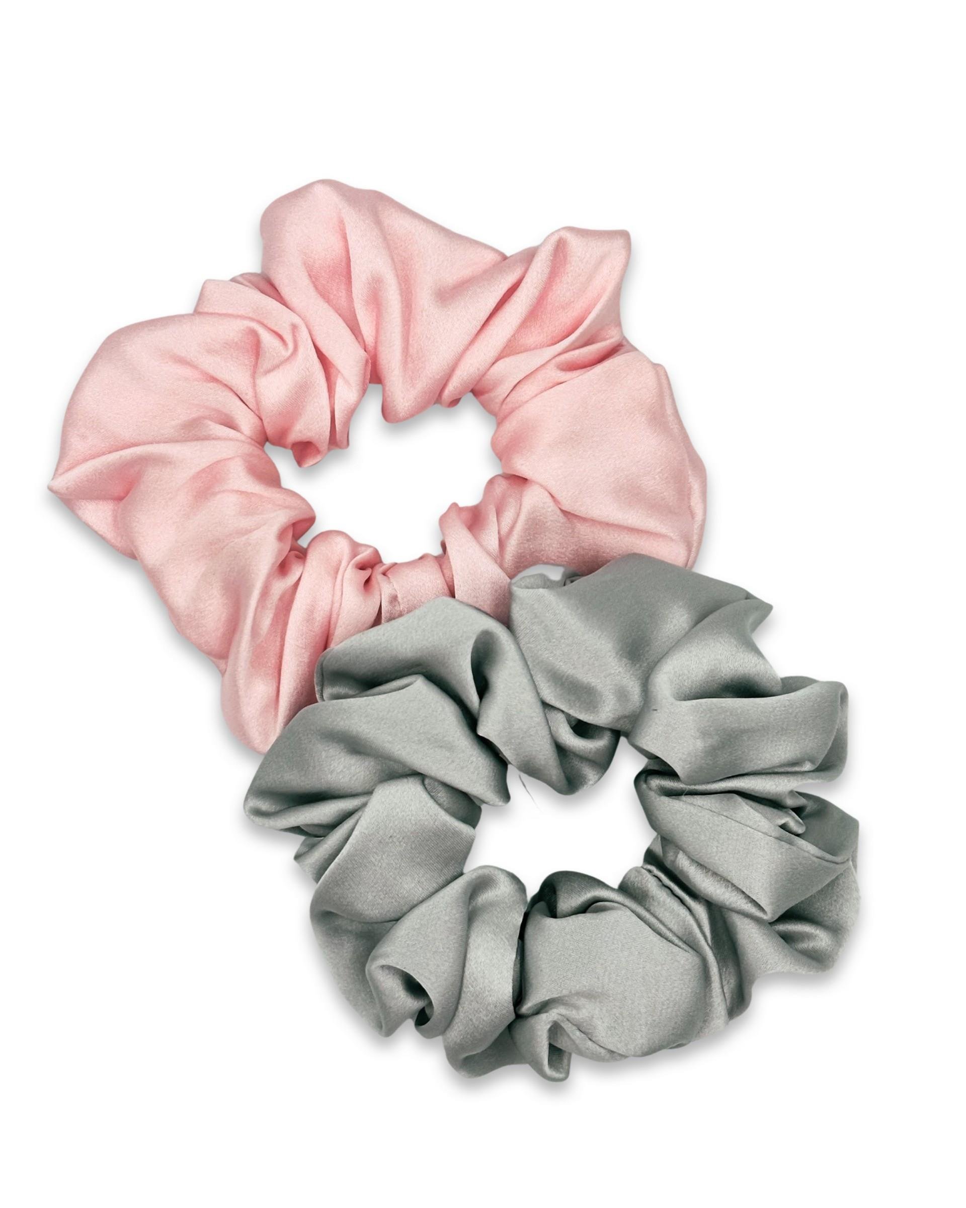 Set Includes: 1 x Silver Grey Pink Dual Color Silk Hair Band; 1 x Medium Silk Hair Scrunchie - Silver Grey; 1 x Medium Silk Hair Scrunchie - Pink. International Certification OEKO-TEX Standart 100 certified - no chemicals and toxins.